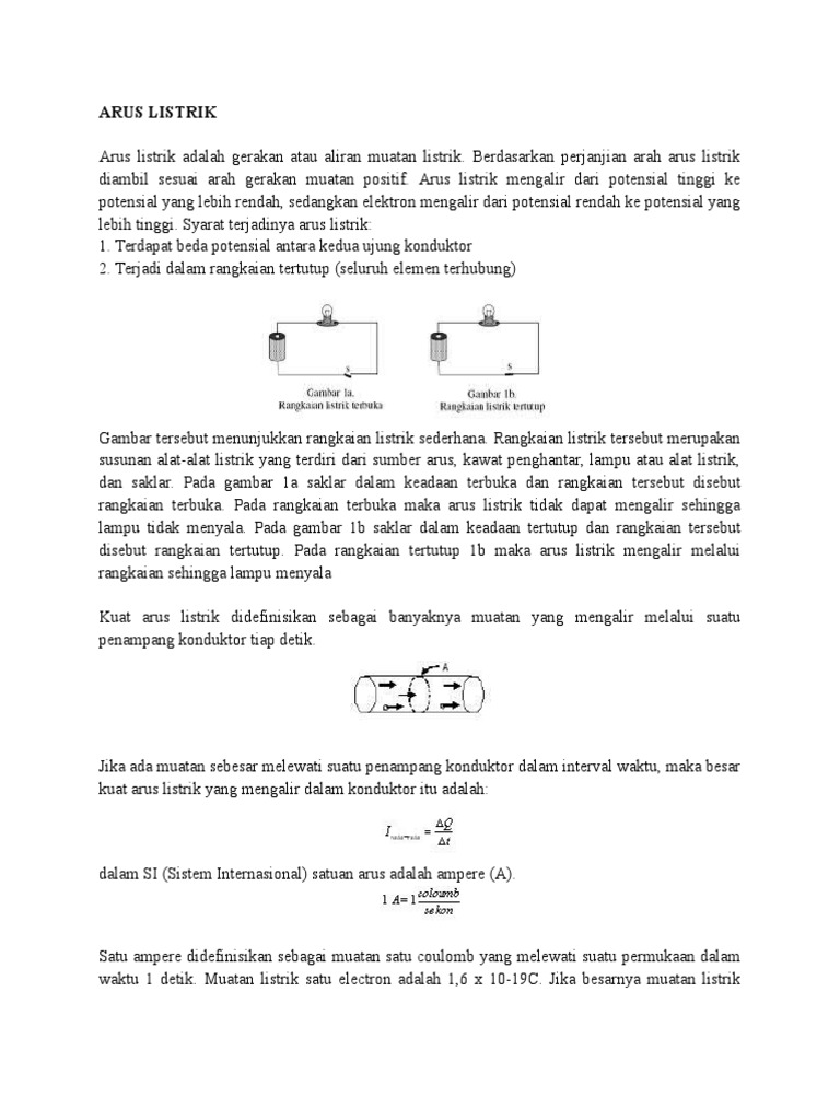 Listrik Docx from imgv2-2-f.scribdassets.com Peristiwa mengalirnya arus listrik disebabkan karena adanya elektron yang bergerak. Sebuah arus listrik atau listrik dinamis adalah laju aliran muatan listrik melewati suatu titik:2:622atau bagian:614 arus listrik dikatakan ada ketika ada aliran bersih muatan listrik melalui suatu bagian.:832 muatan listrik dibawa oleh partikel bermuatan, sehingga arus listrik adalah aliran partikel muatan. Kemampuan penghantar mengalirkan elektron ditentukan oleh susunan atom dari bahan penghantar tersebut.